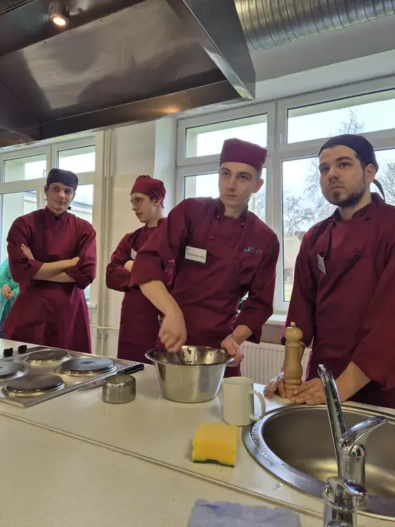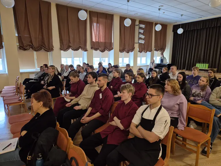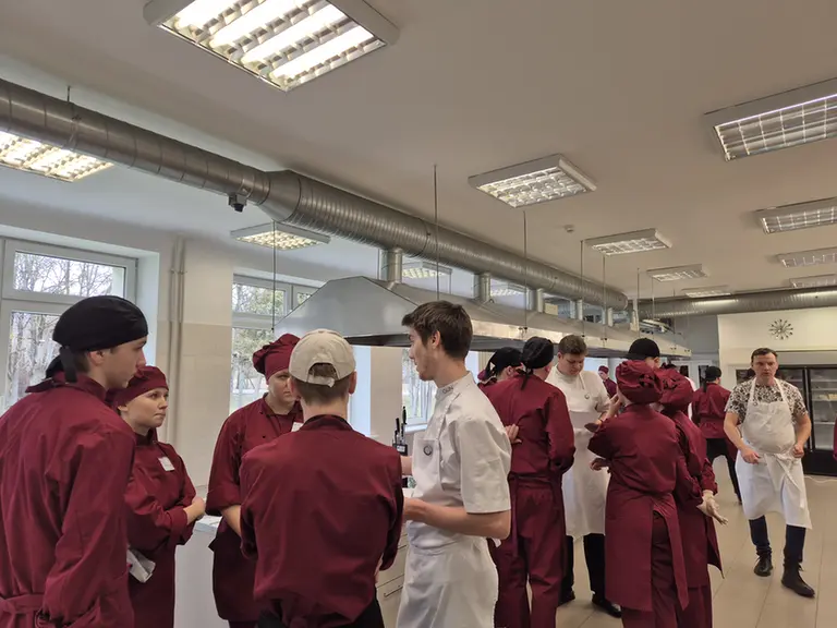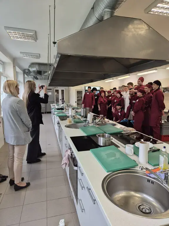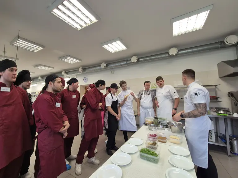 Pēc pārtraukuma sarunas turpinājās virtuvē - laboratorijā, kur notika praktiskā dienas daļa. Meistarklasi 20 topošajiem pavāriem no dažādiem kursiem vadīja pieredzējuši pavāri Kristaps Sīlis un Emīls Skalbergs no restorāna “JOHN CHEF'S HALL” un Roberts Paulāns no restorāna “Barents”. Audzēkņi ar dažādu pieredzi lieliski sadarbojās komandās, strādāja ar interesi un atbildību.