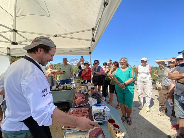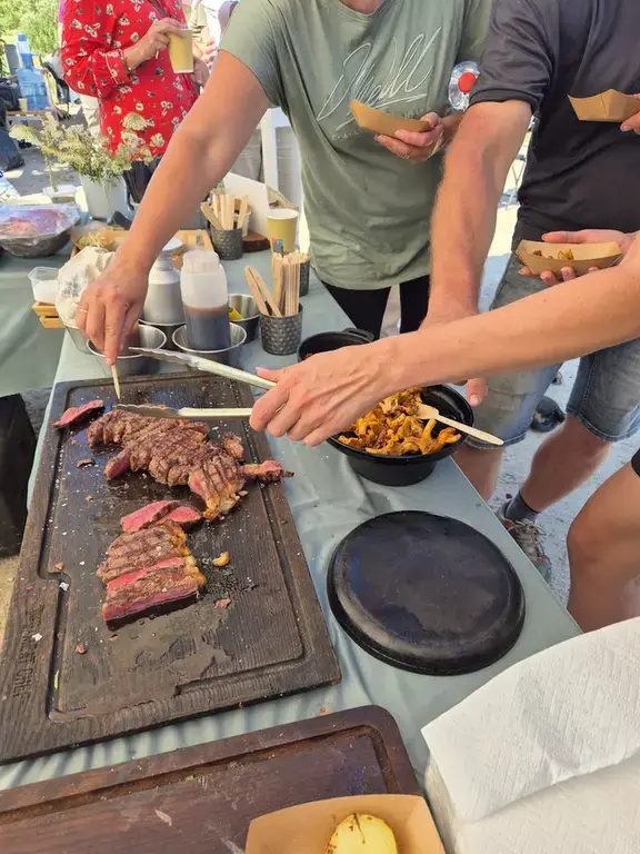 Devāmies ekskursijā - izzinošā pārgājienā Latvijas Dabas fonda pļavu ekspertu Baibas Strazdiņas un Līgas Gavares, un entomologa Voldemāra Spuņģa pavadībā. Atgriežoties pēc apmēram 6 km garā pārgājiena visiem bija lieliska apetīte pusdienām, kam sekoja degustācijas. "Meat Chef" šefpavāra Kaspara Jansona vadībā iepazināmies ar dabiskajās pļavās audzētu liellopu gaļas gatavošanas un garšas niansēm un degustējām izcili garšīgus steiku, pikaņju un fileju. Liellopu gaļu mums laipni sagādāja pļavu saimnieki SIA "Rukši".