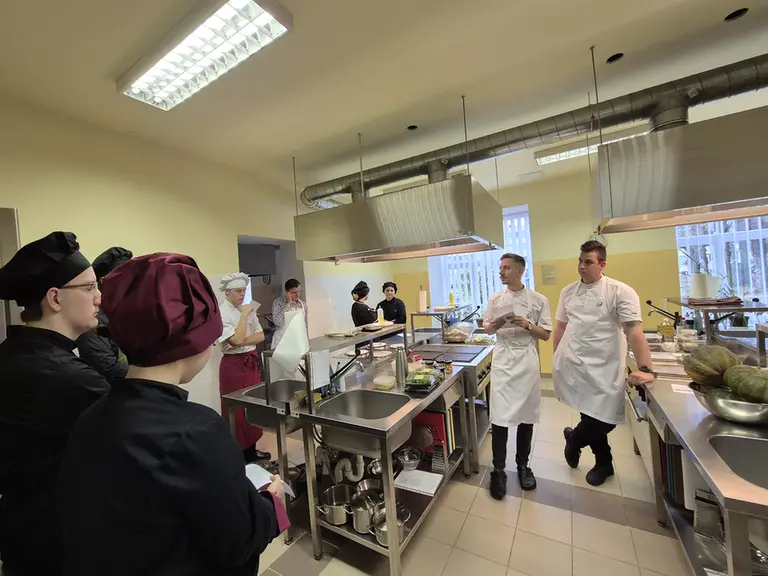 Sekoja praktiskā daļa – meistarklase, ko audzēkņiem vadīja pieredzējuši pavāri - Artūrs Trinkuns no restorāna “Barents” un Markuss Žamoidiks no restorāna “B7”.